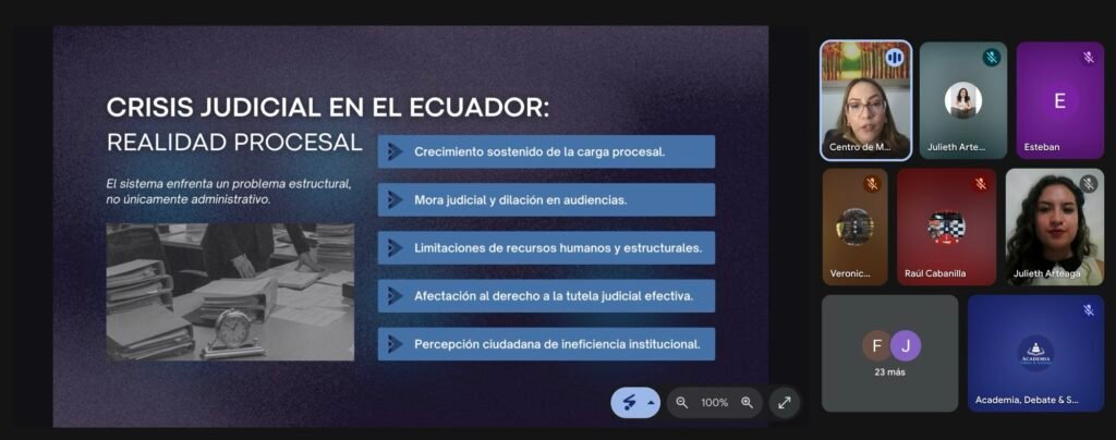 Quito, Ecuador – Con gran éxito y una amplia convocatoria, se llevó a cabo la Masterclass organizada por la Academia Debate & Sociedad. La sesión, liderada por la Msc. Cristina Cabanilla y moderada por Emilia Arteaga, analizó profundamente el rol de la mediación como herramienta transformadora frente al colapso del sistema judicial tradicional.