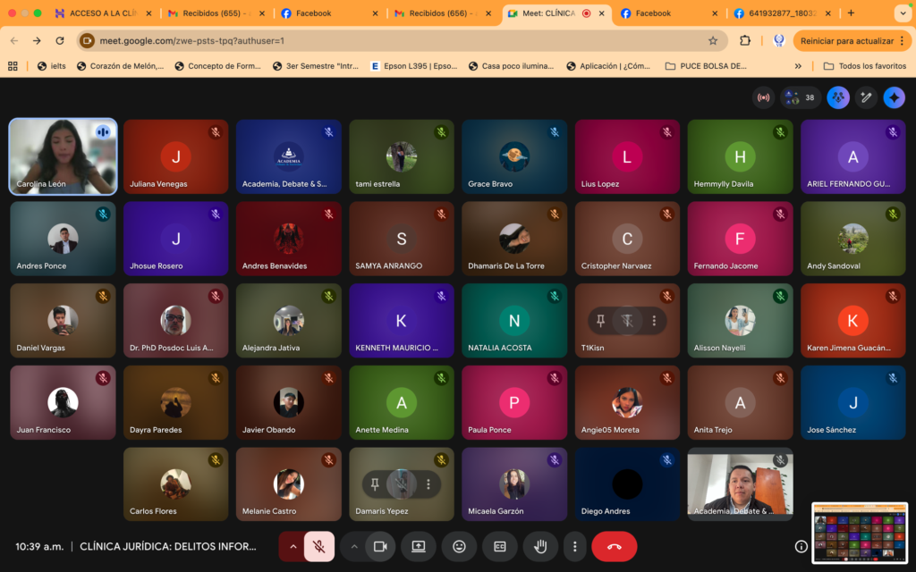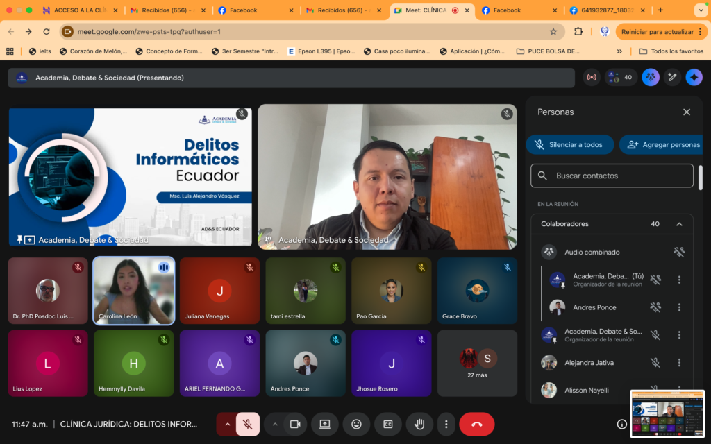 El evento fue conducido y moderado por Caro León, quien destacó la importancia de estos espacios para democratizar el conocimiento técnico y jurídico. La ponencia principal estuvo a cargo del Msc. Luis Alejandro Vásquez, experto en derecho digital, quien profundizó en la tipificación de la criminalidad informática y los desafíos de la nueva legislación.